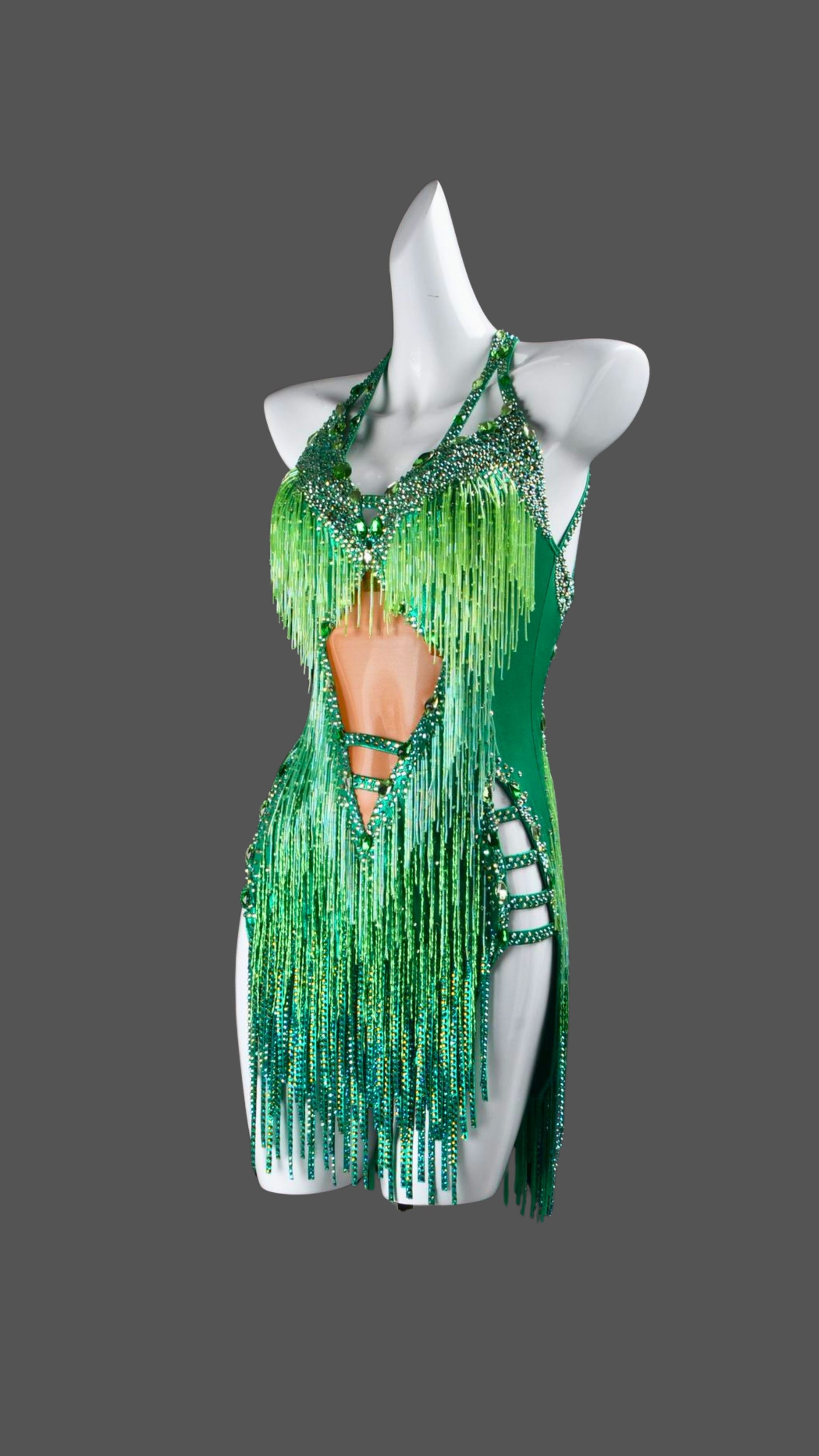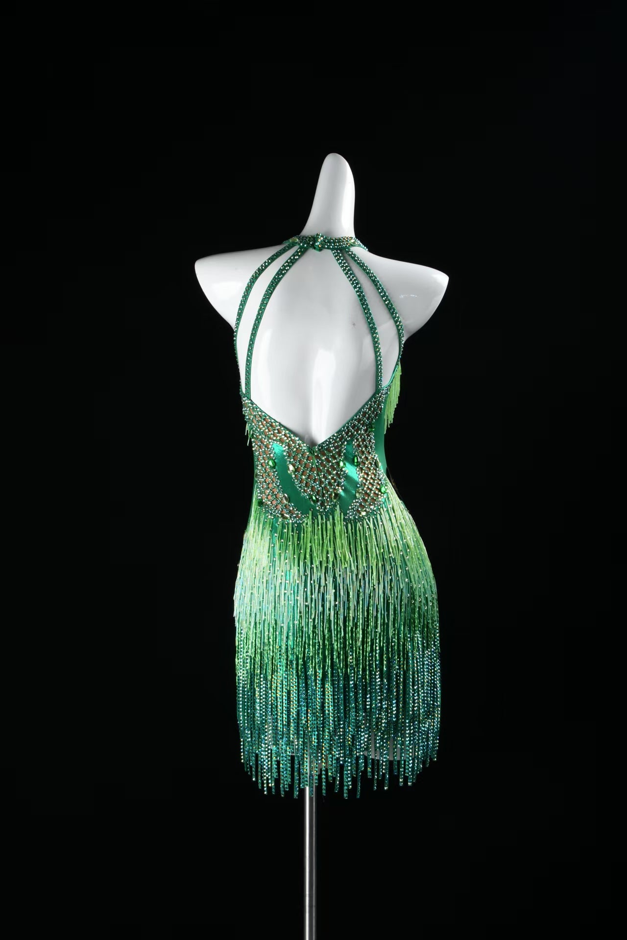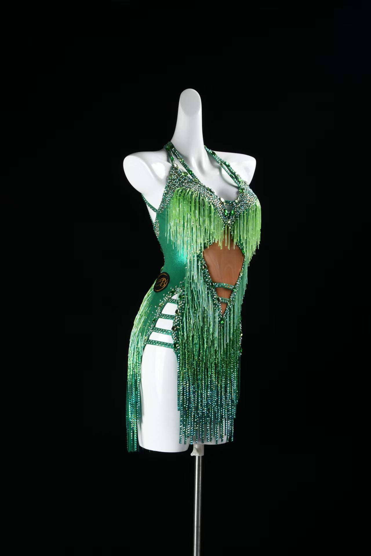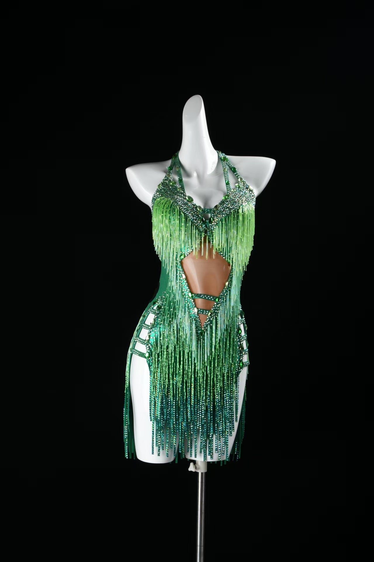 Sexy Green Fringe Latin Dress with Long Sleeves