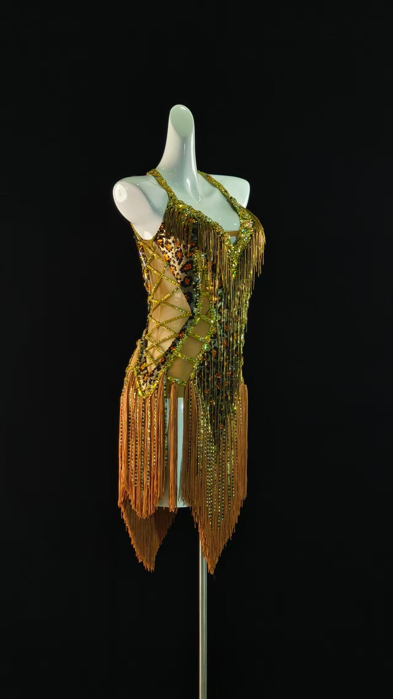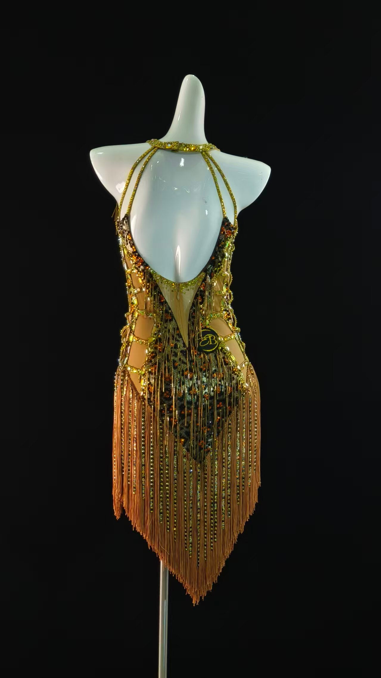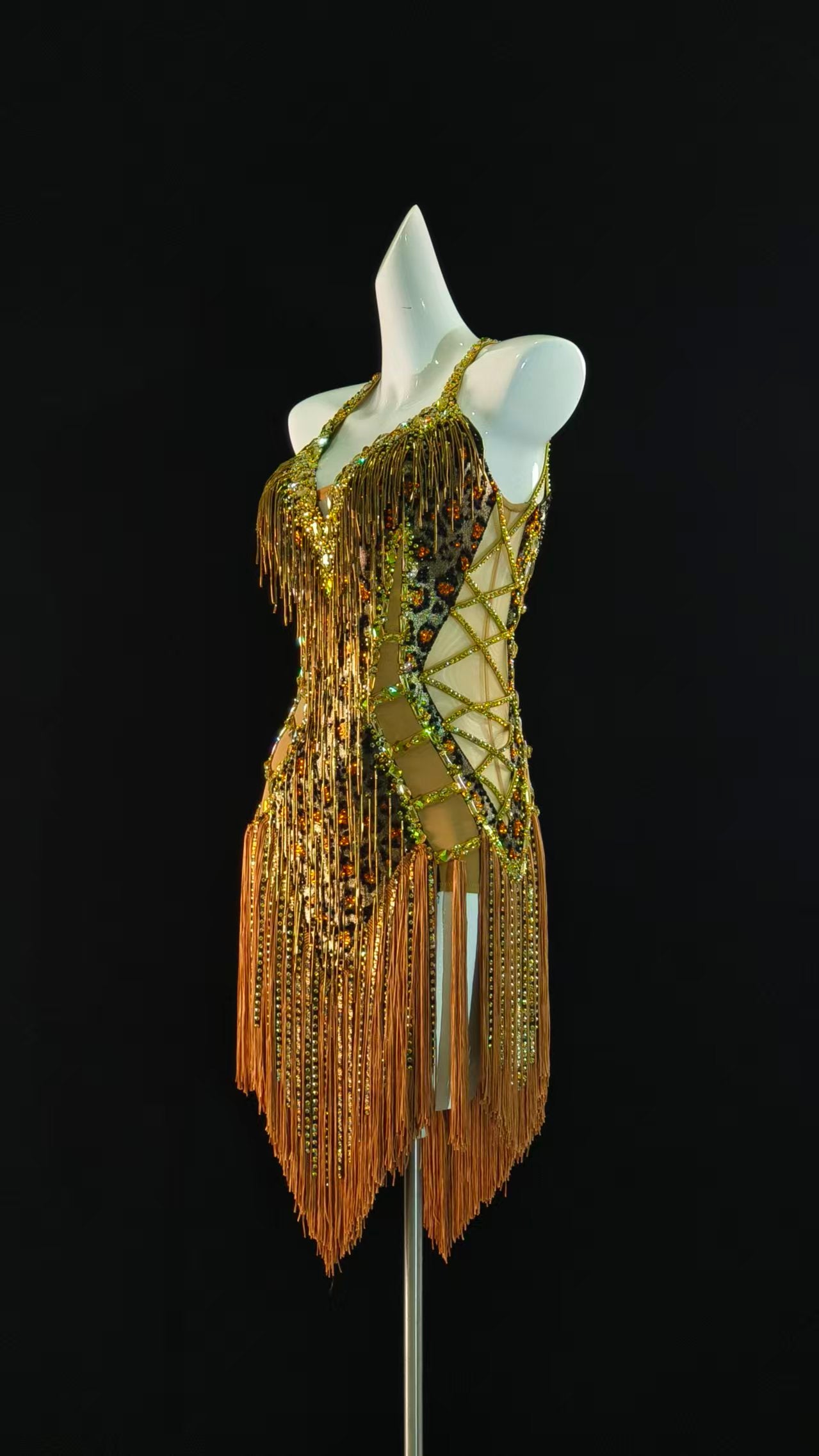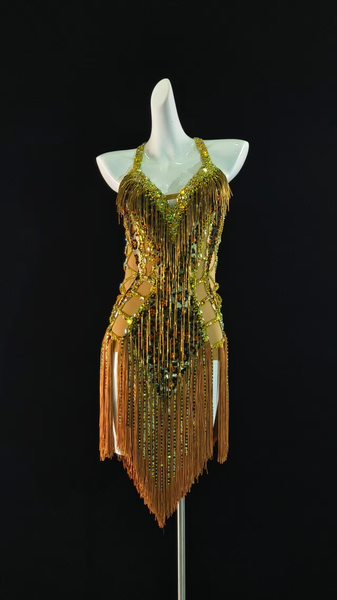 Sexy and Fun Gold Stoned Cloth Fringe Latin Dress