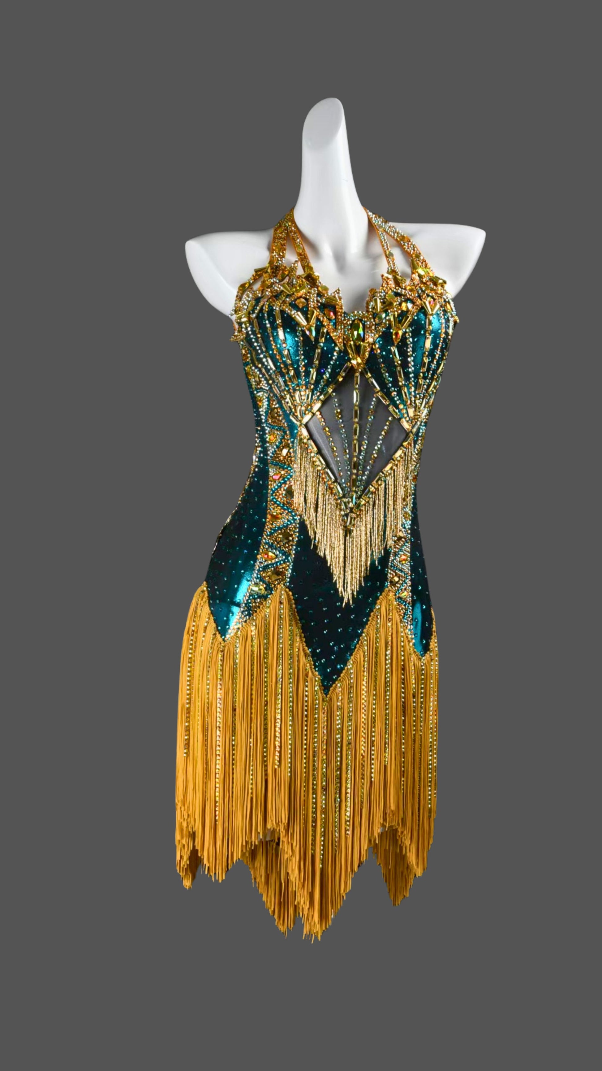 Sexy and Fun Gold Metallic Green Fringe Latin Dress