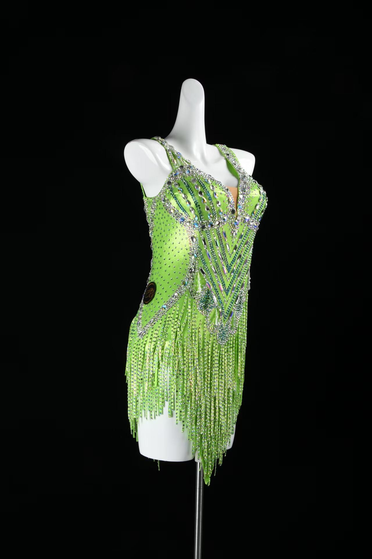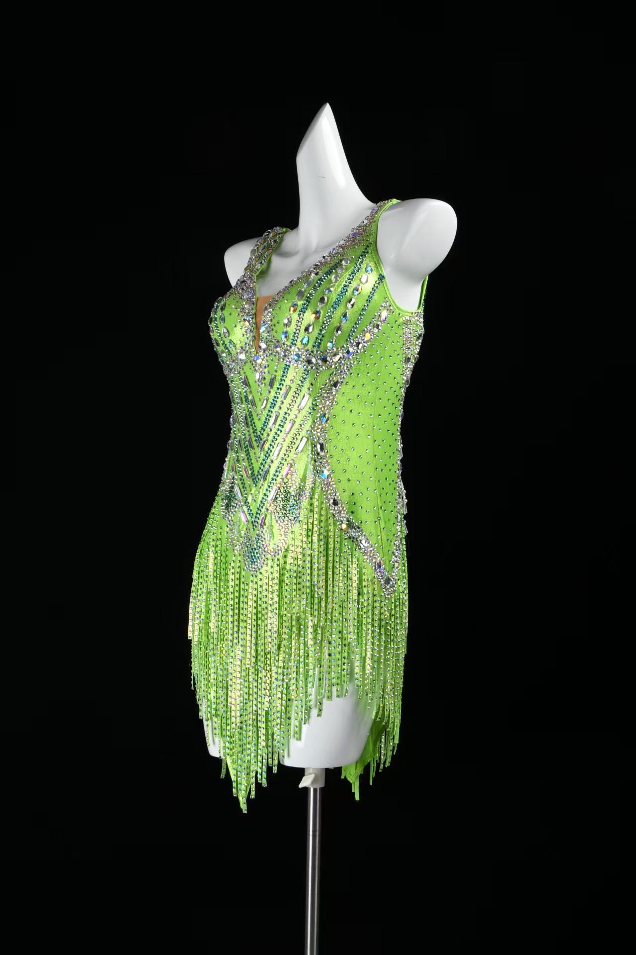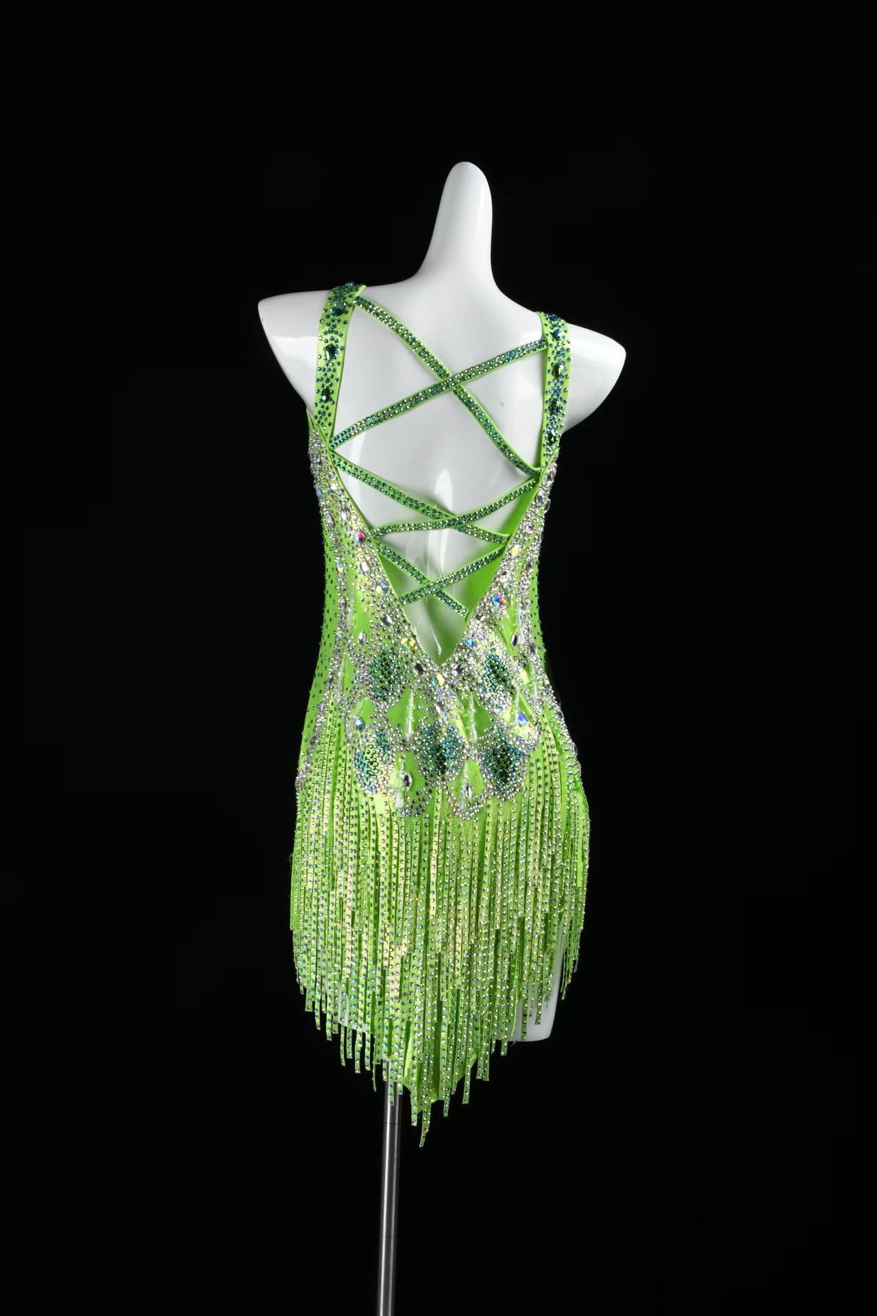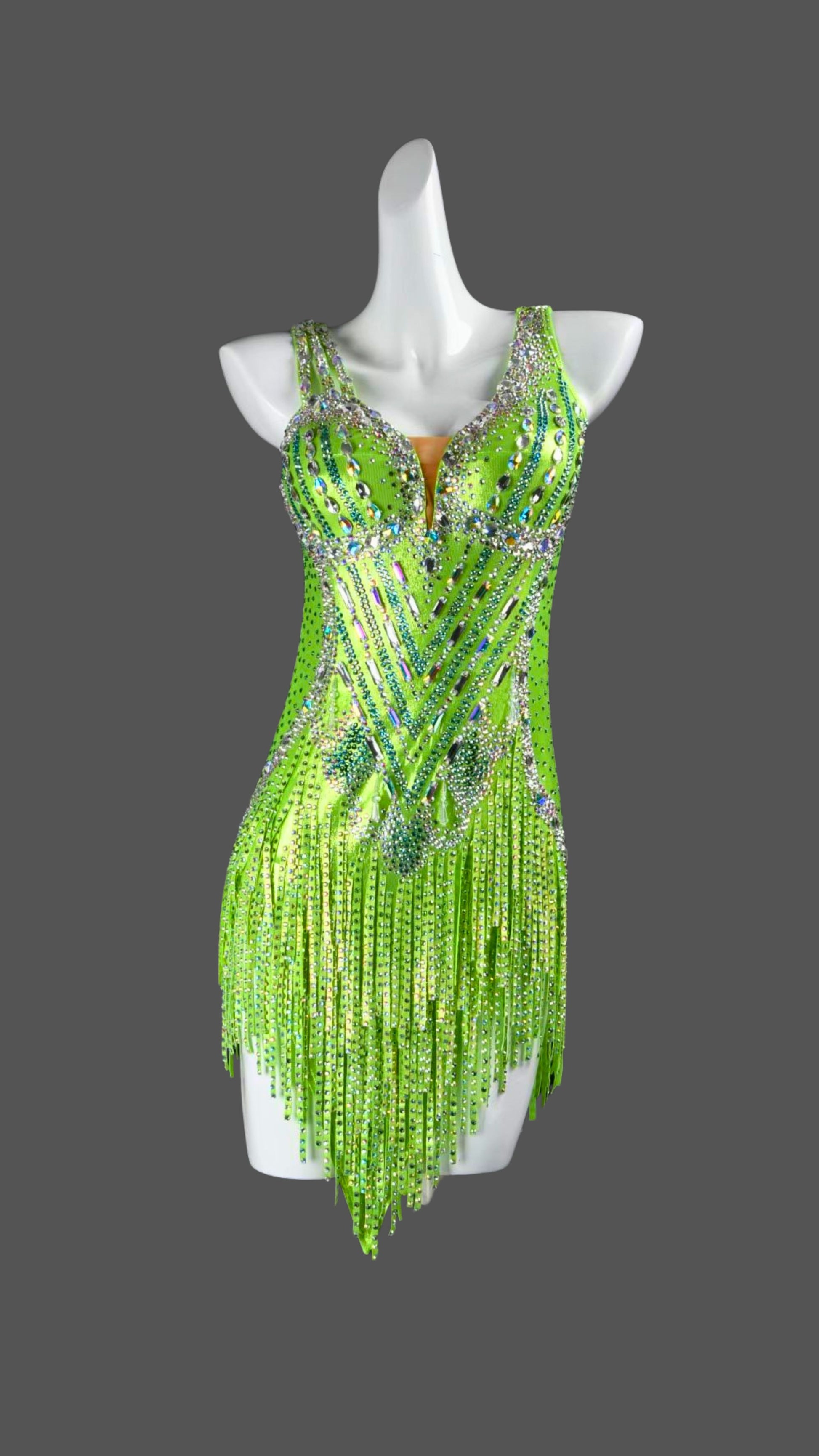 Sexy and Fun Lime Green Stoned Cloth Fringe Latin Dress