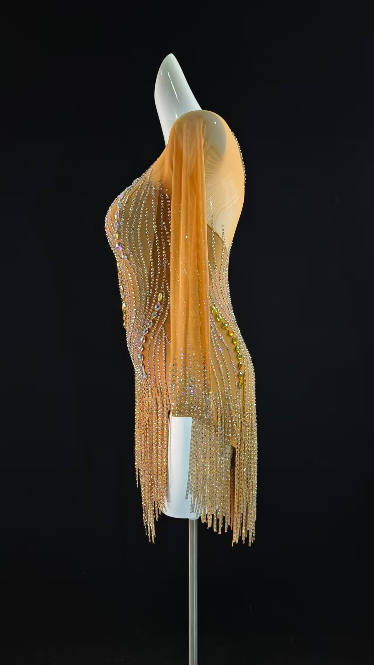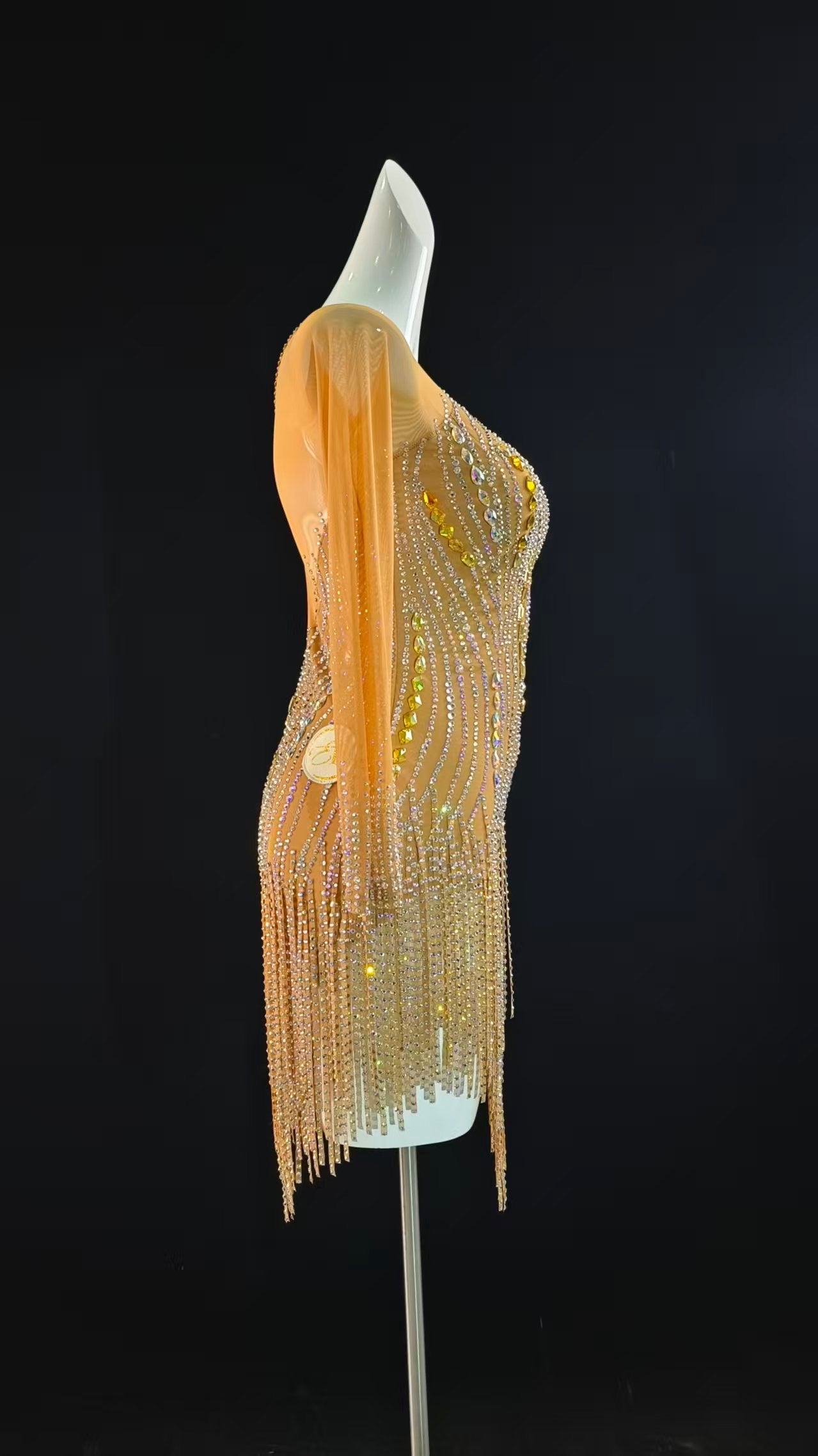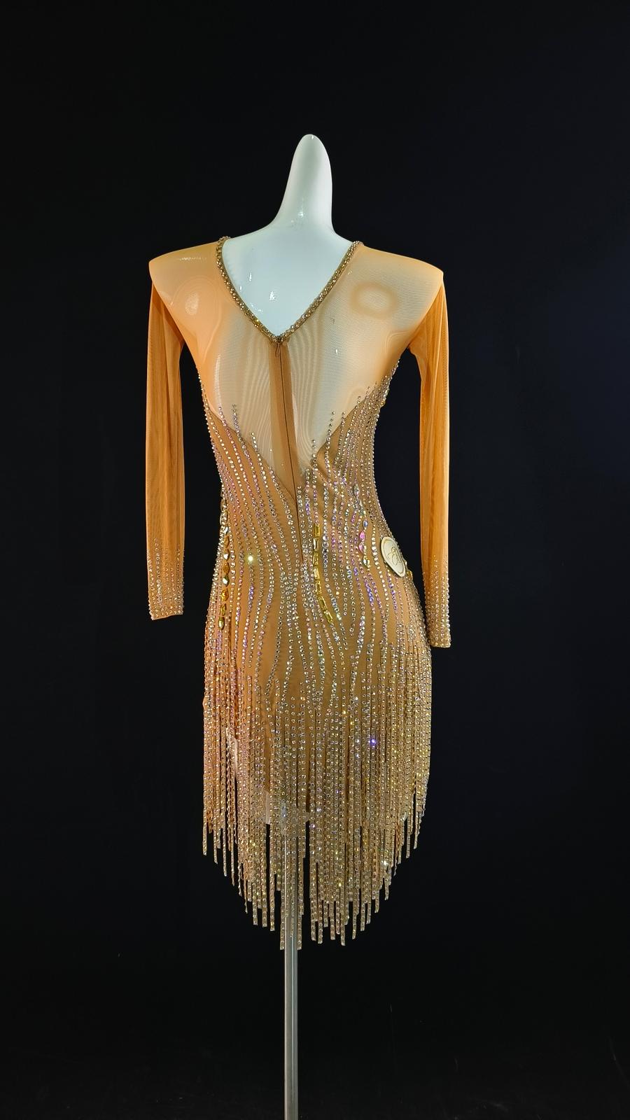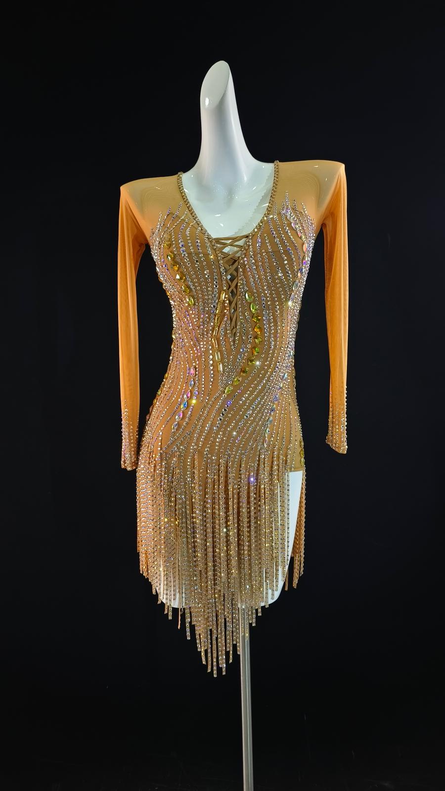 Sexy and Fun Nude Stoned Cloth Fringe Latin Dress with Long Sleeves