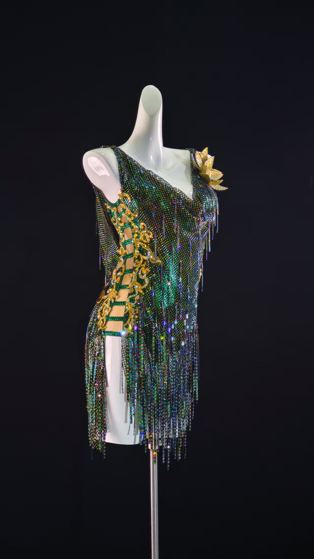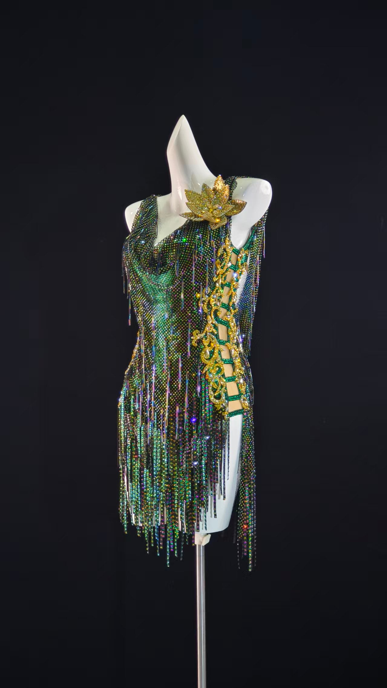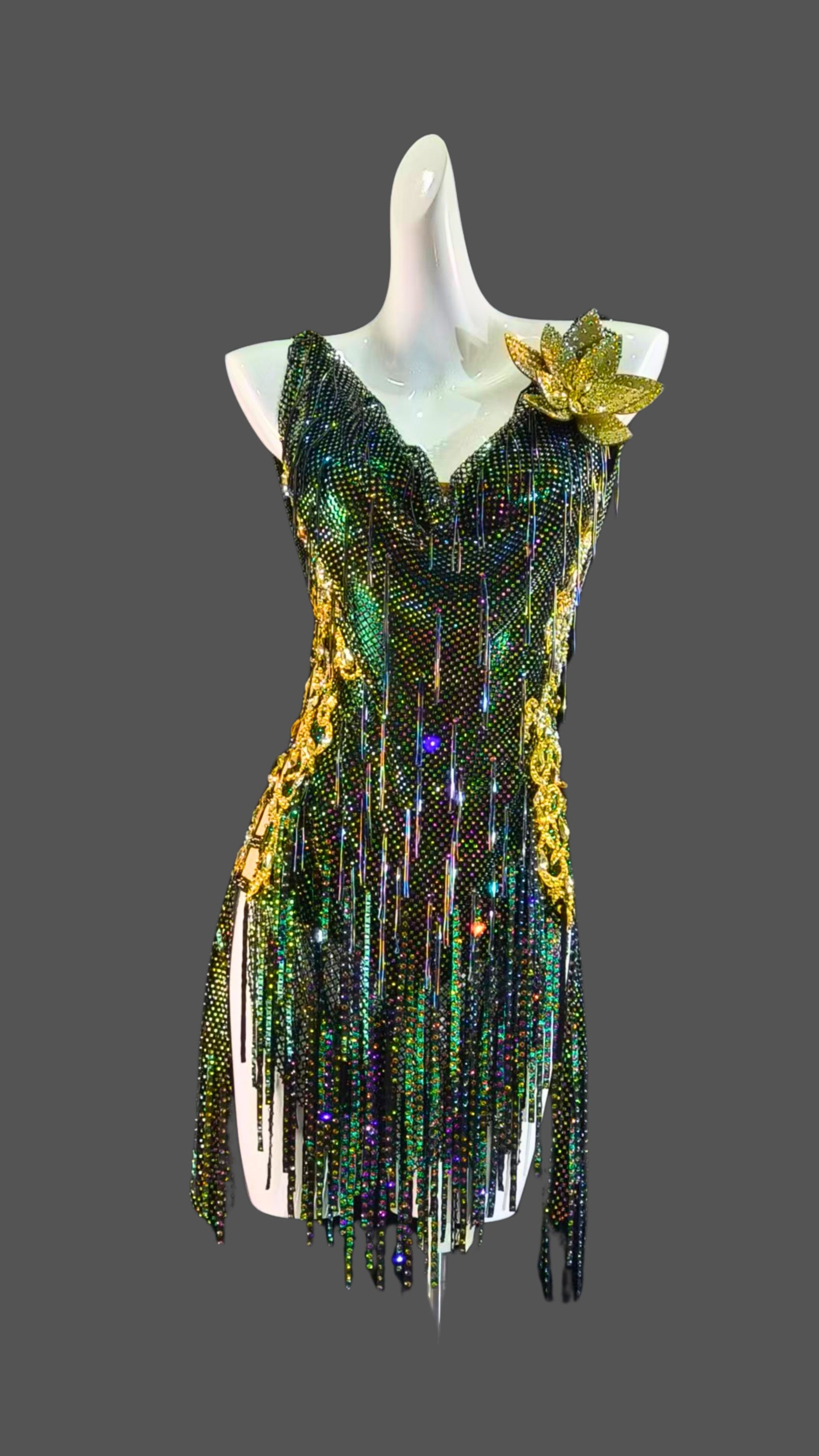 Sexy and Fun Green and Gold Cloth Stoned Fringe Latin Dress